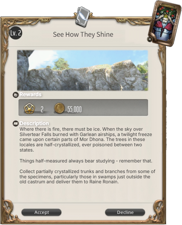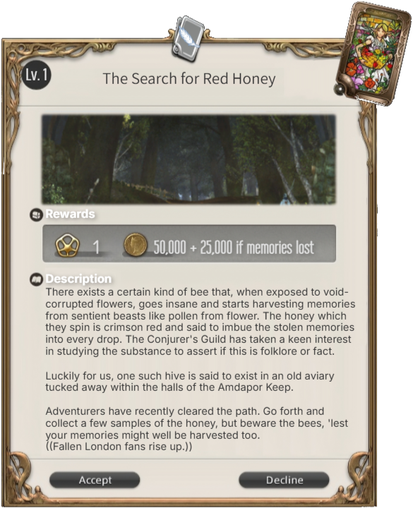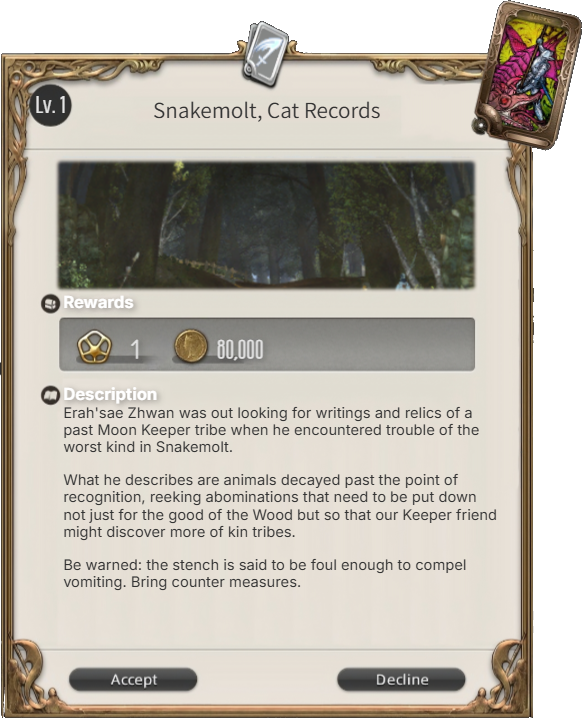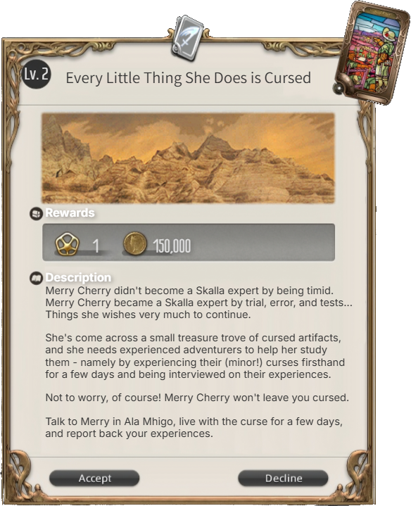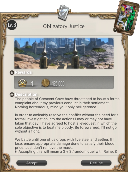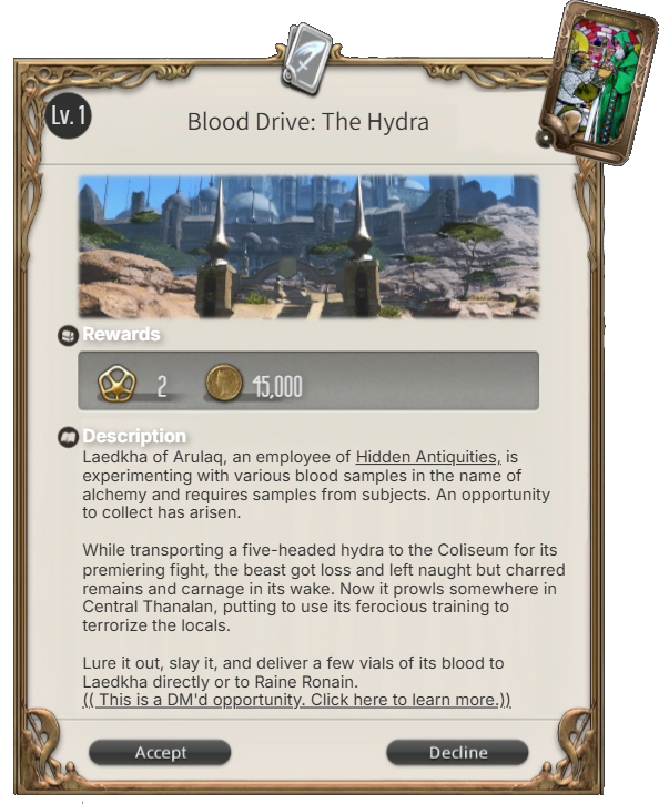 Once claimed, I will DM you on Discord details which may include challenges which have to be ICly overcome in the levequest (and must be addressed to complete it), secrets that may be discovered, and complications that may arise.