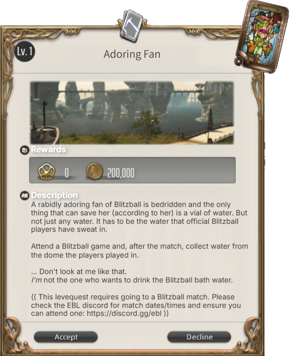 For coordination purposes, we must connect on Discord before I mark the levequest as taken. If you don't want to share your Discord, I understand, but that means you won't be able to take a levequest from the board.