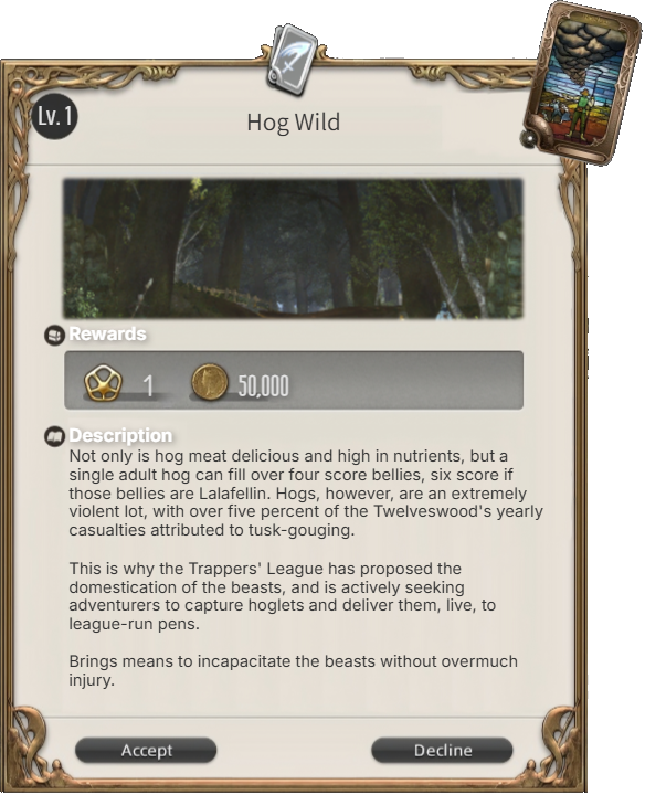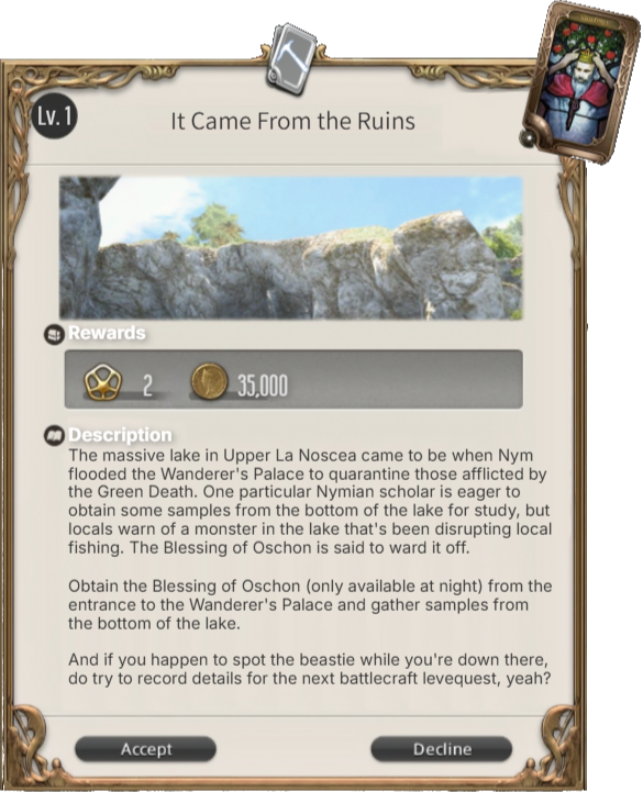 These tasks are called “levequests,” and if someone happens to be interested in accepting one, they are presented with a leve plate that is used in conjunction with the quest. Leve plates are, in effect, passes which grant their bearers “leave” to perform various actions which might otherwise be prohibited, such as the eradication of beasts, admittance to restricted areas, and more."