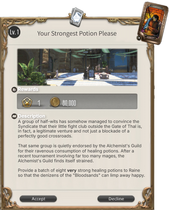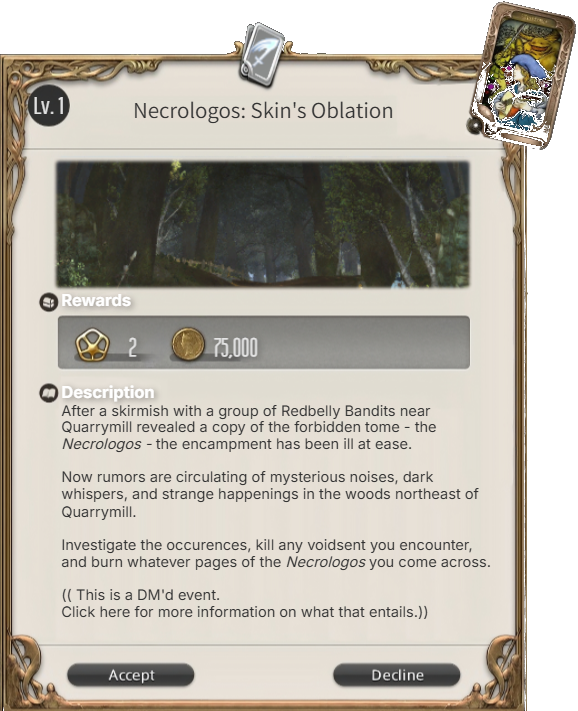 "In a realm as large as this one, there will always be those who are looking for someone willing to assist them with their troubles. Instead of doing the searching on their own, they often come to a local guild or similar organization to have their petition documented.