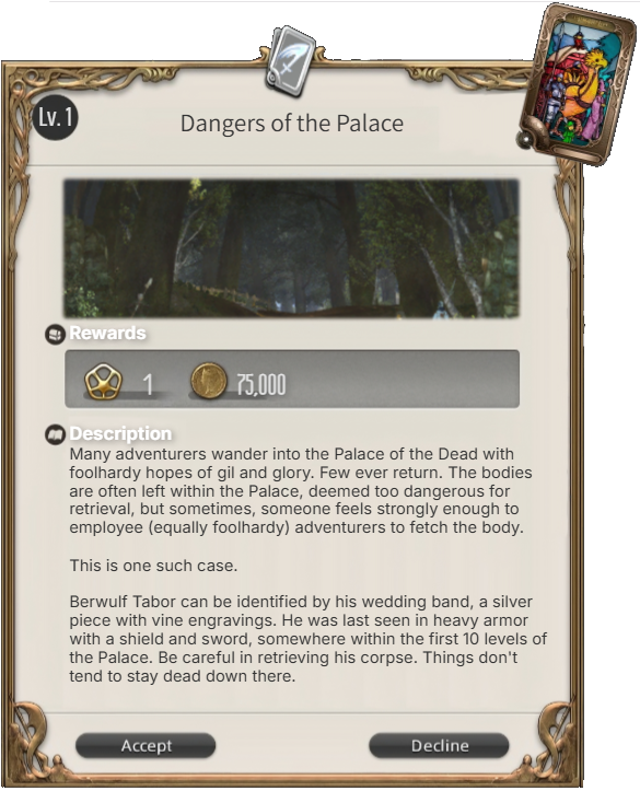 Upon accepting a levequest, I might give a few things to guide your process...