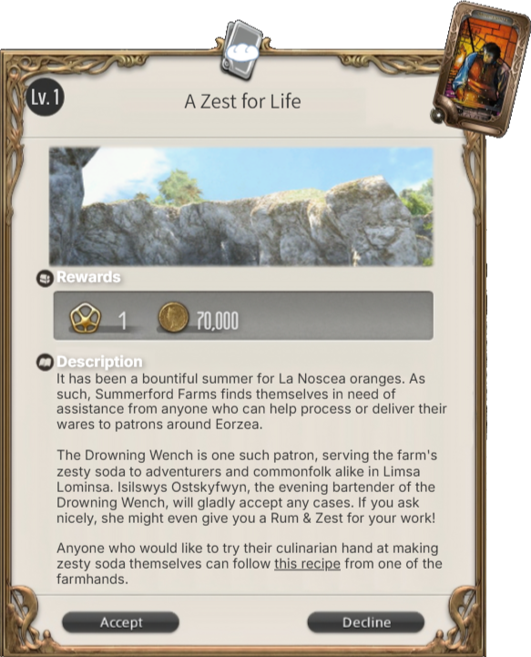 Levequests can then be completed by either DM'd event, short story, gpose stories, or other creative medium. Once the desired medium is submitted (via Discord), the levequest is considered complete, but your character will have to ICly catch Raine again to be paid.