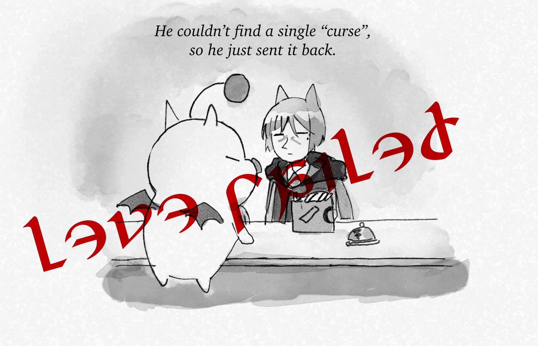 As Kibby defends Sweet Mallow from goblins, Sweet Mallow reels in a vile Illuminate Perch - only for her valiant defender, Kibby, to reward himself with it as a treat, leaving Sweet Mallow fishless but alive.