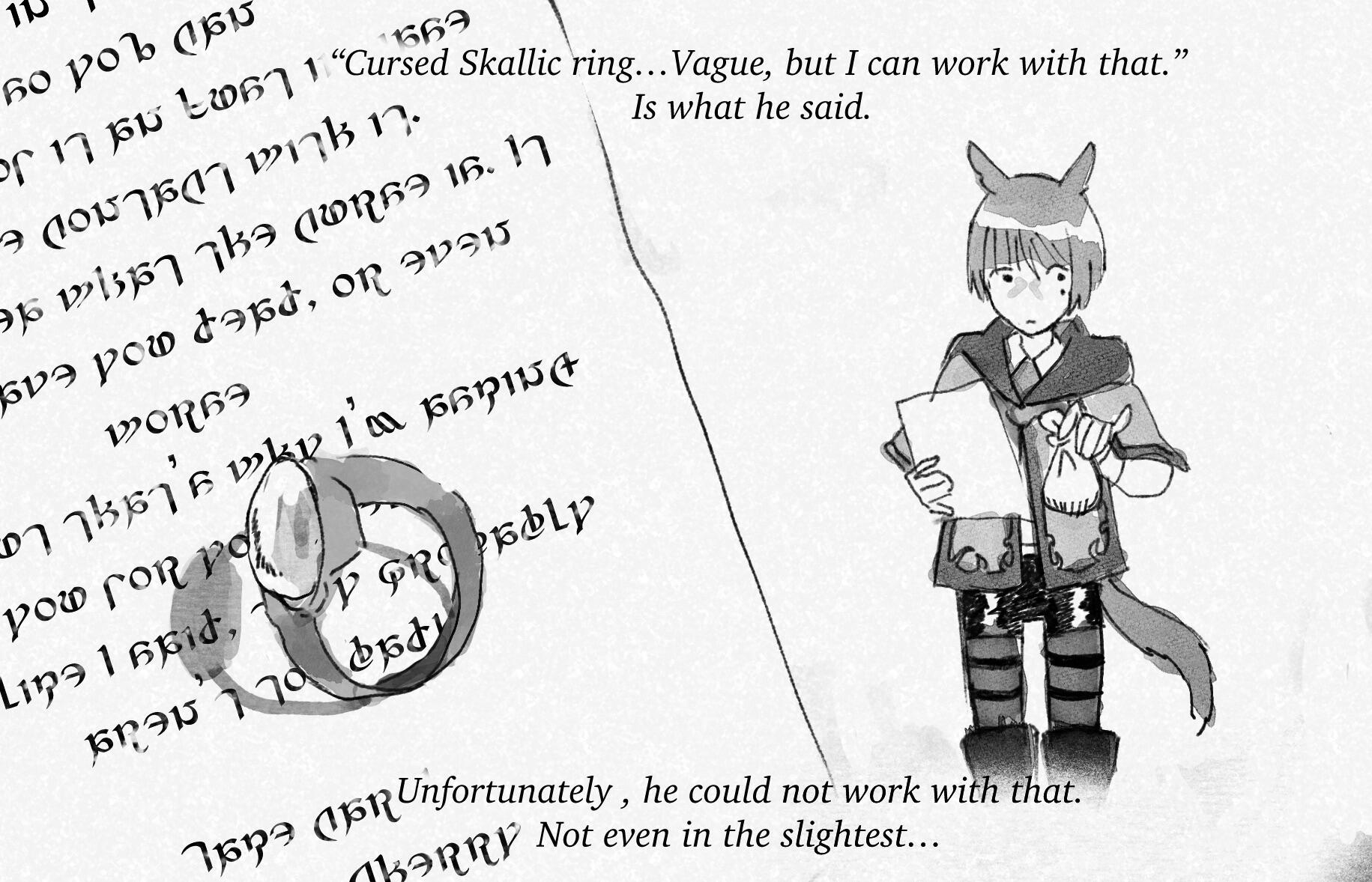 Sweet Mallow and her feline companion Kibby set to the Thaliak river to fish up an Illuminate Perch when Sweet Mallow's beset by harsh memories. She recovers in time to check her line and see the movement of Illuminate goblin gliders.