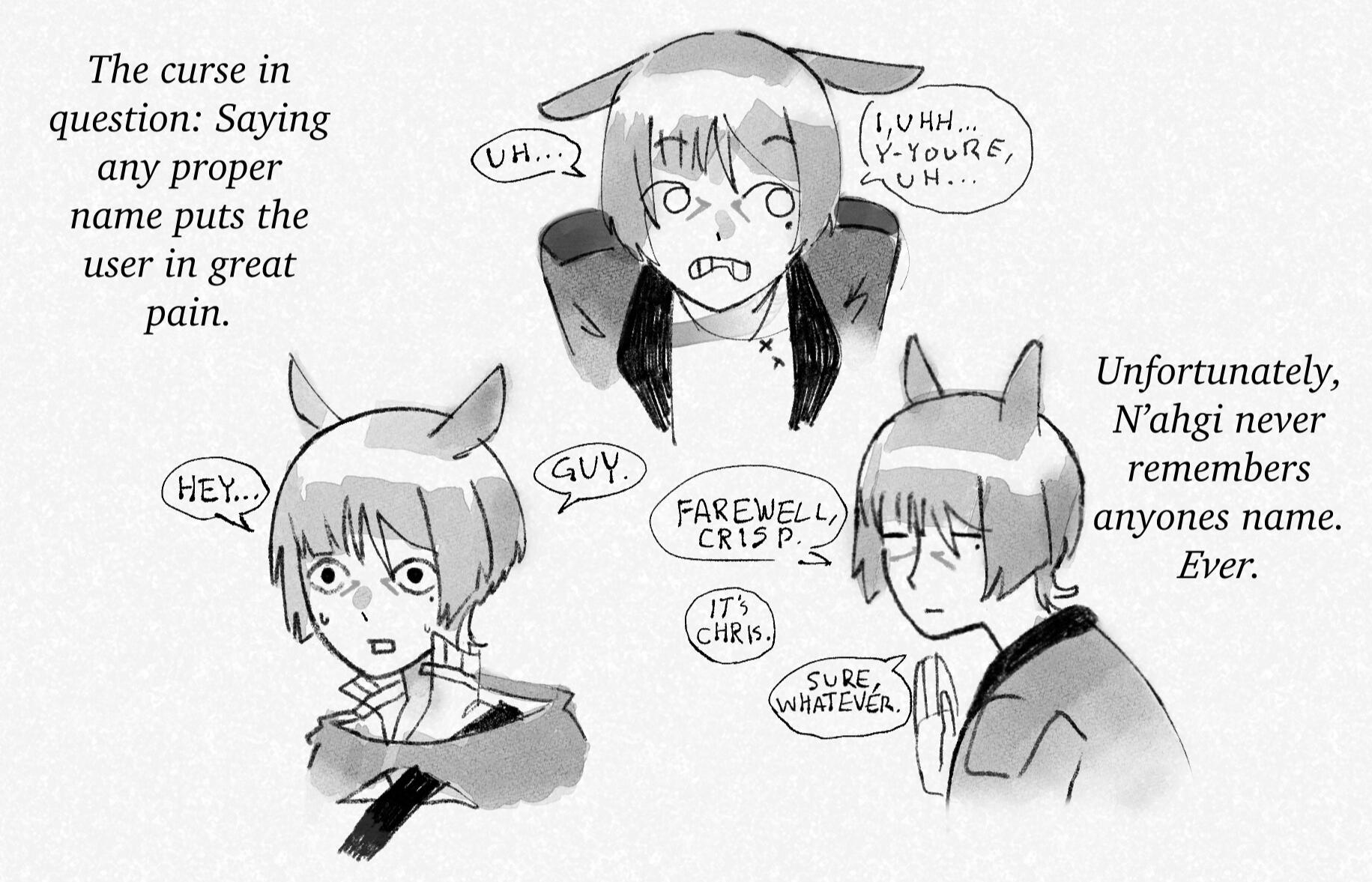 Curse: The character is cursed to feel pain every time they say a proper name, and should therefore only stick to nicknames